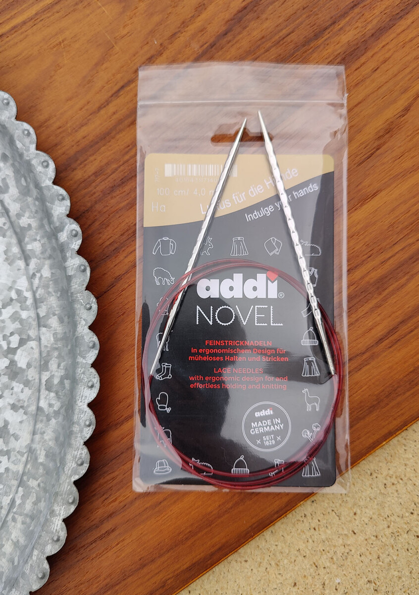 Addi Novel är en kollektion av stickor med ergonomisk design och lace-tippar för precisionsarbete – denna nya stil av stickor är av särskilt intresse för alla som tycker att det är obekvämt att greppa konventionella stickor och för dig som lider av artros i händerna.