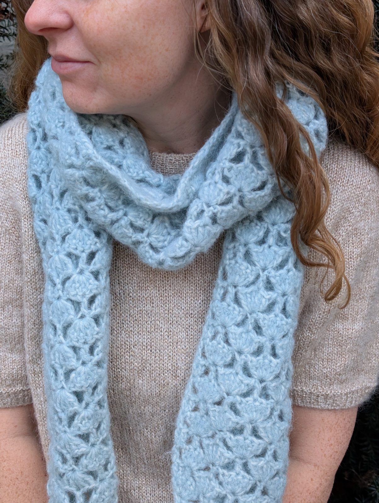 Alicia Halsduk är en grovvirkad sjalhalsduk i vackert mussel/snäckmönster med snibbformade ändar.
