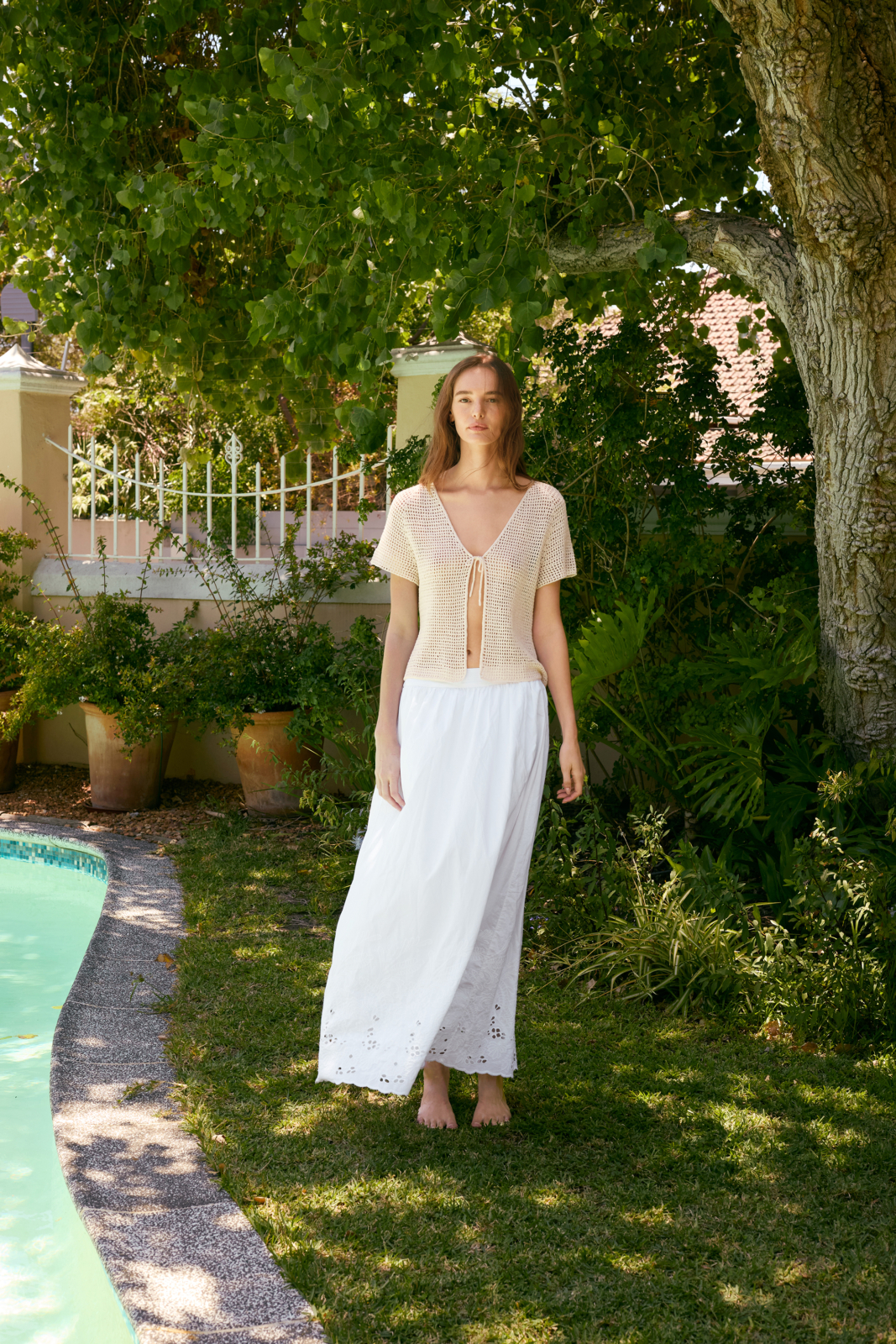 Ava Blouse är en virkad kofta som virkas uppifrån och ner i Tynn Line med v-ringning, raglan och knytning fram.