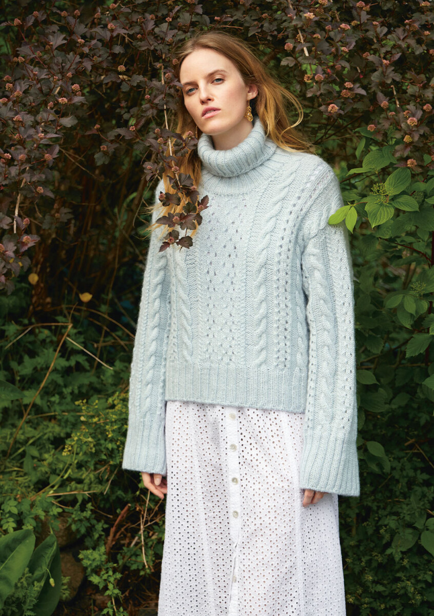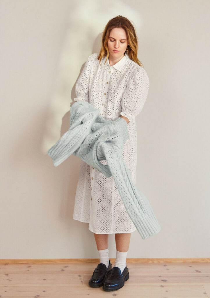 På bild stickad i Alpakka Ull 5811 Arctic Ice + Tynn Silk Mohair 5811 Arctic Ice.