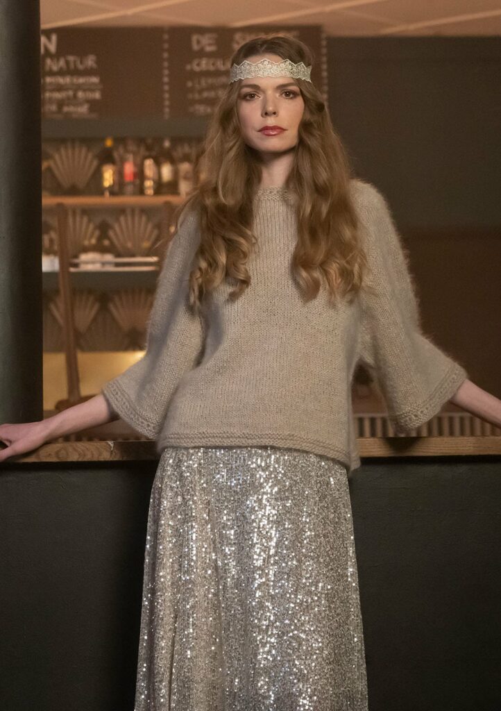 Tröja med djup ärm och tjusiga detaljerPlagget stickas uppifrån och ned, i ett stycke.