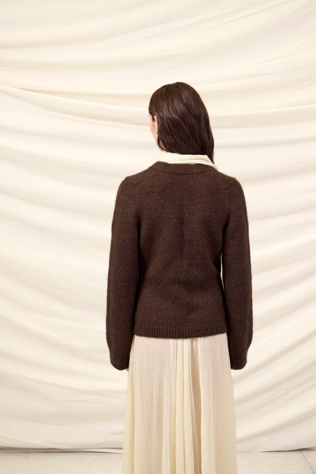 På bild stickad i Alpakka Ull i färgen Kaffe 3581 + Tynn Silk Mohair Dark Fudge 4381