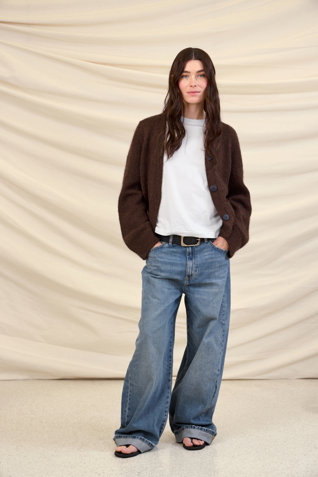 Ember Cardigan är en klassisk och stilren kofta som stickas uppifrån och ner med en tråd Alpakka Ull och en tråd Tynn Silk Mohair. V-ringning, format liv, slätstickade ärmar och dubbelstickad framkant med påsydda fickor.