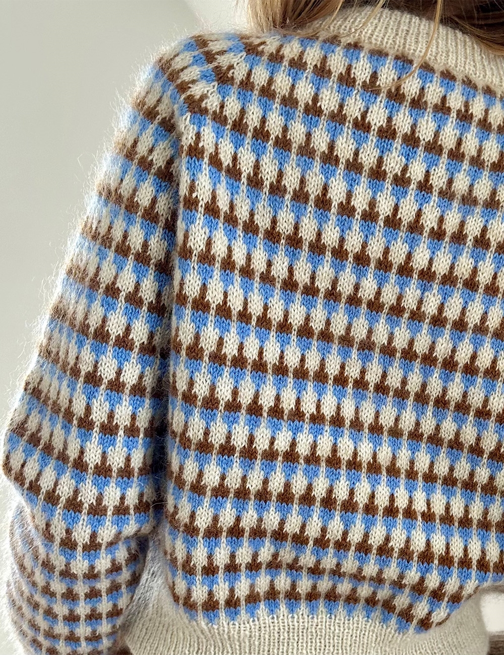 Facet Sweater är en raglantröja med ett litet grafiskt mönster. Mönstret består av tre färger, men det stickas bara med två färger åt gången och rapporterna är korta, vilket gör det lättare att sticka. Då det inte går åt så mycket garn av mönsterfärgerna är Facet Sweater ett perfekt projekt för restgarner. Du kan också ”leka” med mönstret och sticka med fler än två mönsterfärger. Plagget stickas uppifrån och ner.