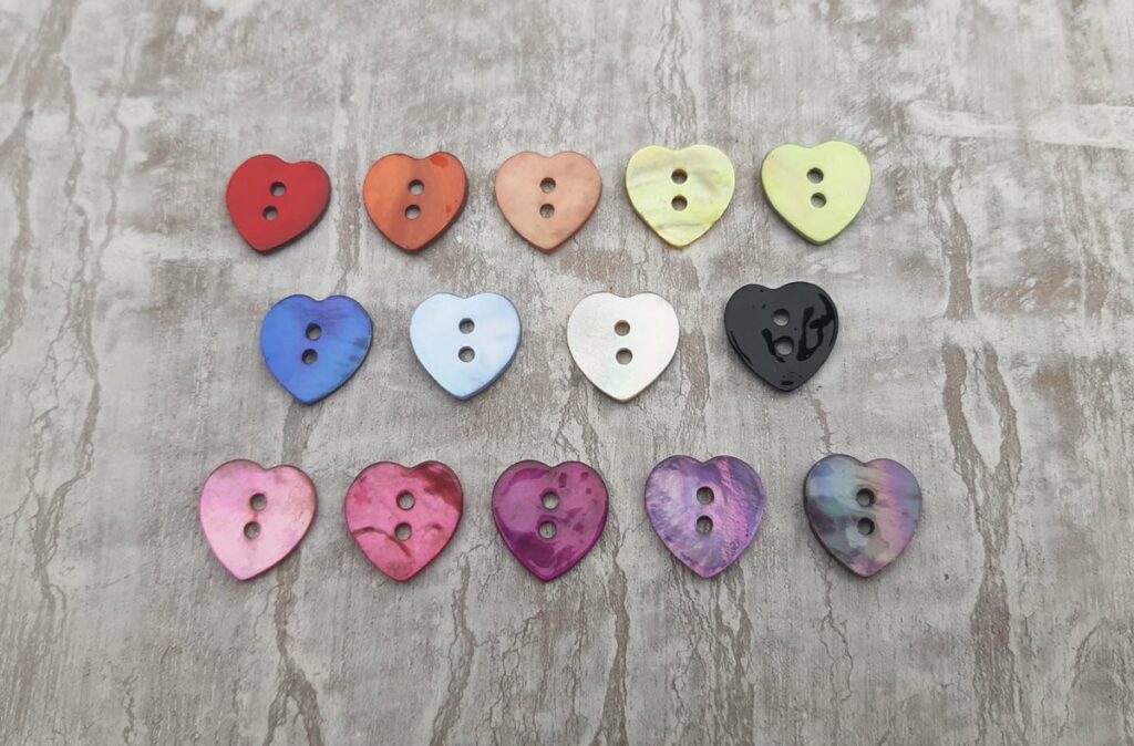 Pärlemorknappar från New Old Company, formade som små hjärtan. Tvättas med fördel i tvättpåse för att förhindra att de blir kantstötta.
