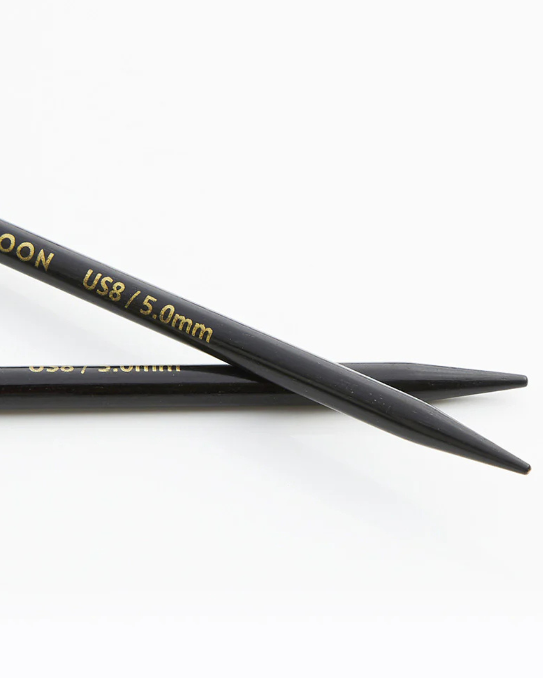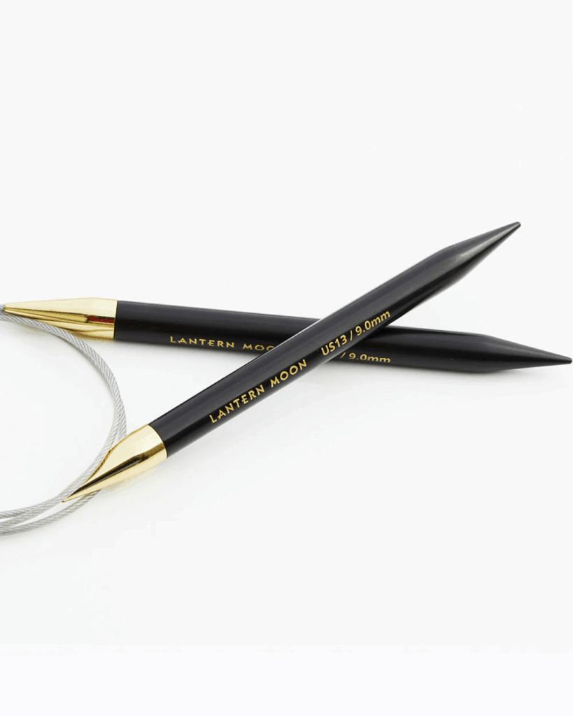 Spetsarna på Lantern Moons rundstickor är tillverkade av ebenholts, ett av världens mest värdefulla träslag. Den silkeslena ytan på dessa lätta fasta rundstickor, tillsammans med den 24K förgyllda mässingskopplingen, garanterar en jämn och problemfri stickning utan att garnet fastnar. Den smidiga kabeln är vridfri och ligger platt vid förvaring. De noggrant slipade och formade spetsarna fungerar utmärkt med alla typer av garn.