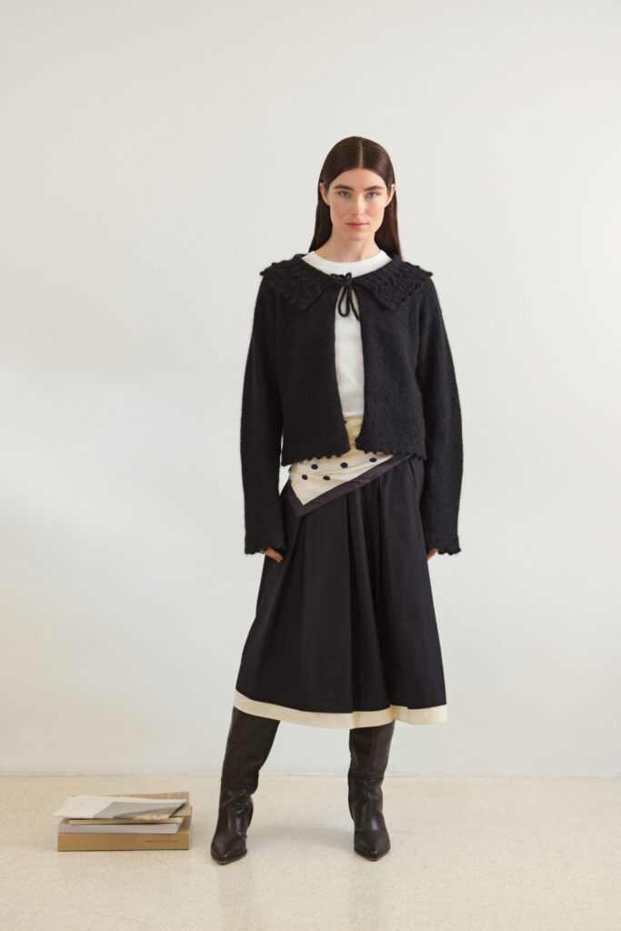 Lilly Blouse som stickas fram och tillbaka, uppifrån och ner med en tråd Tynn Silk Mohair och en tråd Alpakka Følgetråd. Raglankonstruktion, formad hals, brettekant med popcorn och i-cord-detaljer.