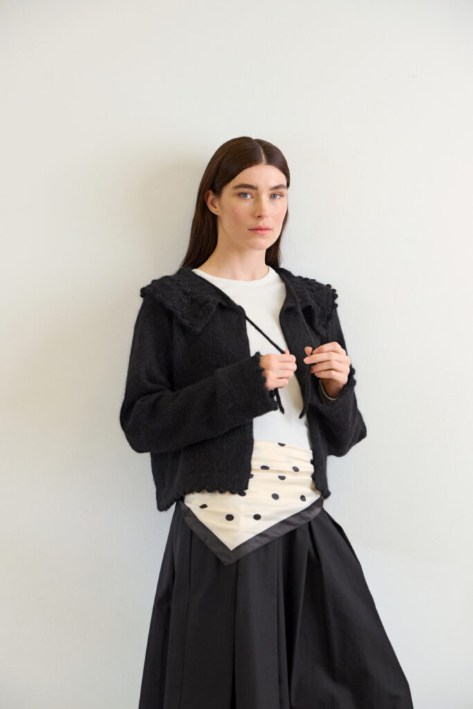 På bild stickad i Tynn Silk Mohair med Alpakka Følgetråd i färgerna Mint Green 7911 och Svart 1099.