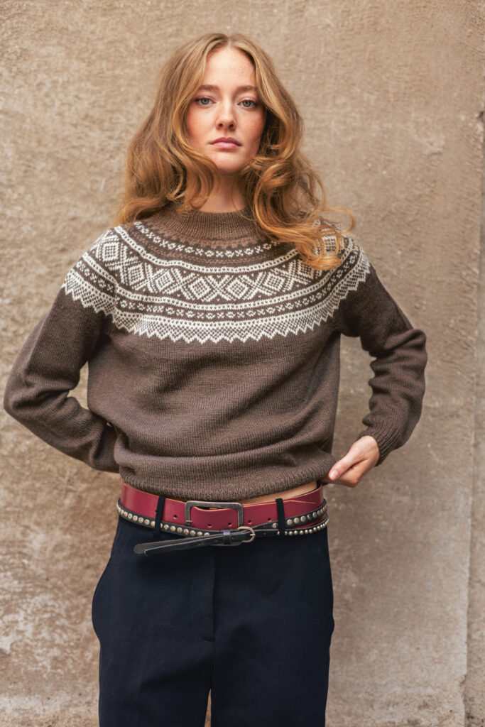Denna Marius-tröja i Tynn Peer Gynt har en mjuk A-linjeform som ger ett modernt uttryck till det klassiska mönstret. Plagget stickas uppifrån och ner, i ett stycke
