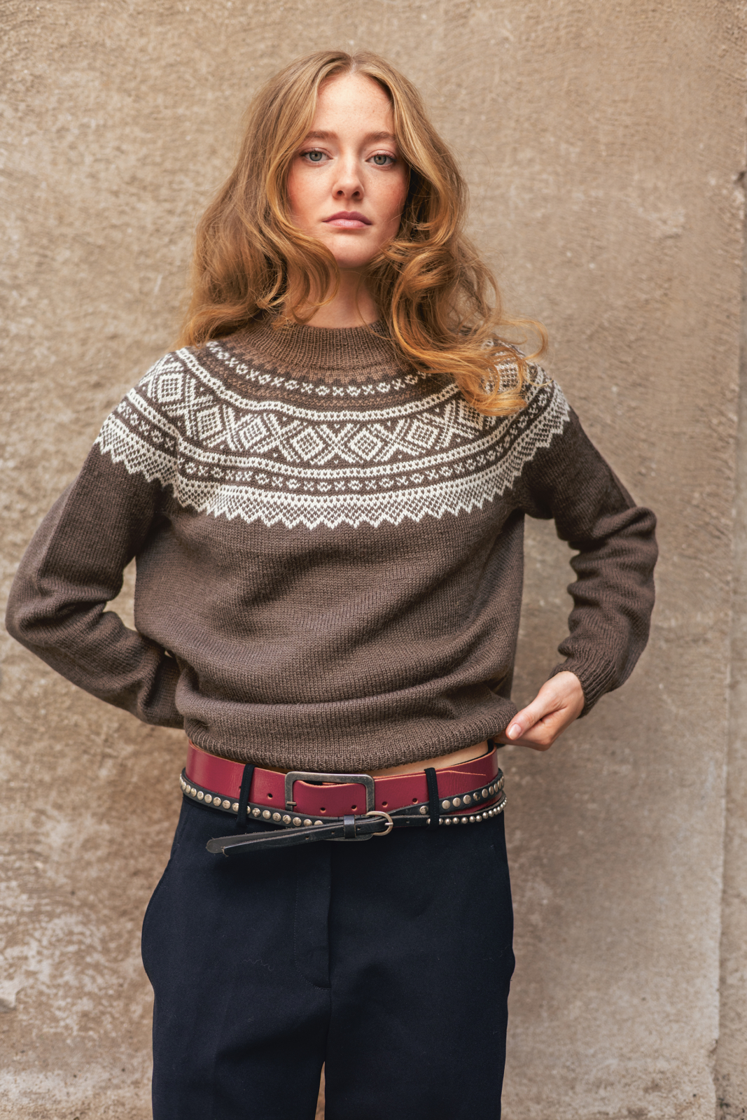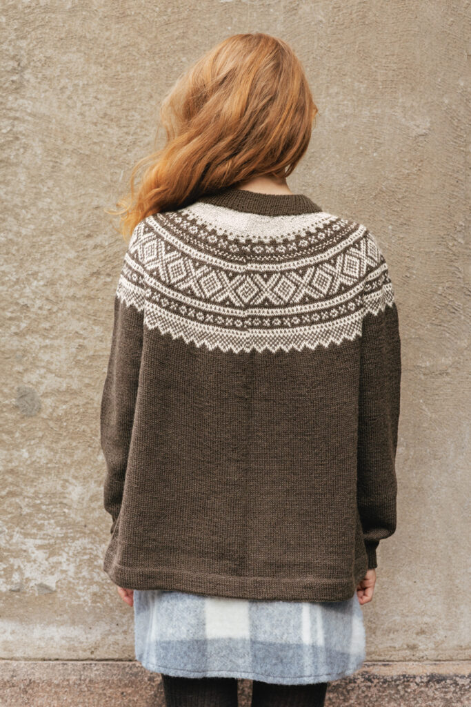 På bild stickad i Tynn Peer Gynt 3880 Mörk Choklad och 2441 Naturmelerad