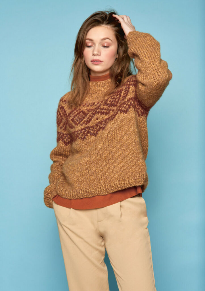 På bild stickad i Børstet Alpakka 2543 Brunt Socker (F1) och 3355 Rost (F2) + Kos 2533 Ljus Gulbrun och 4342 Taupe (F2)