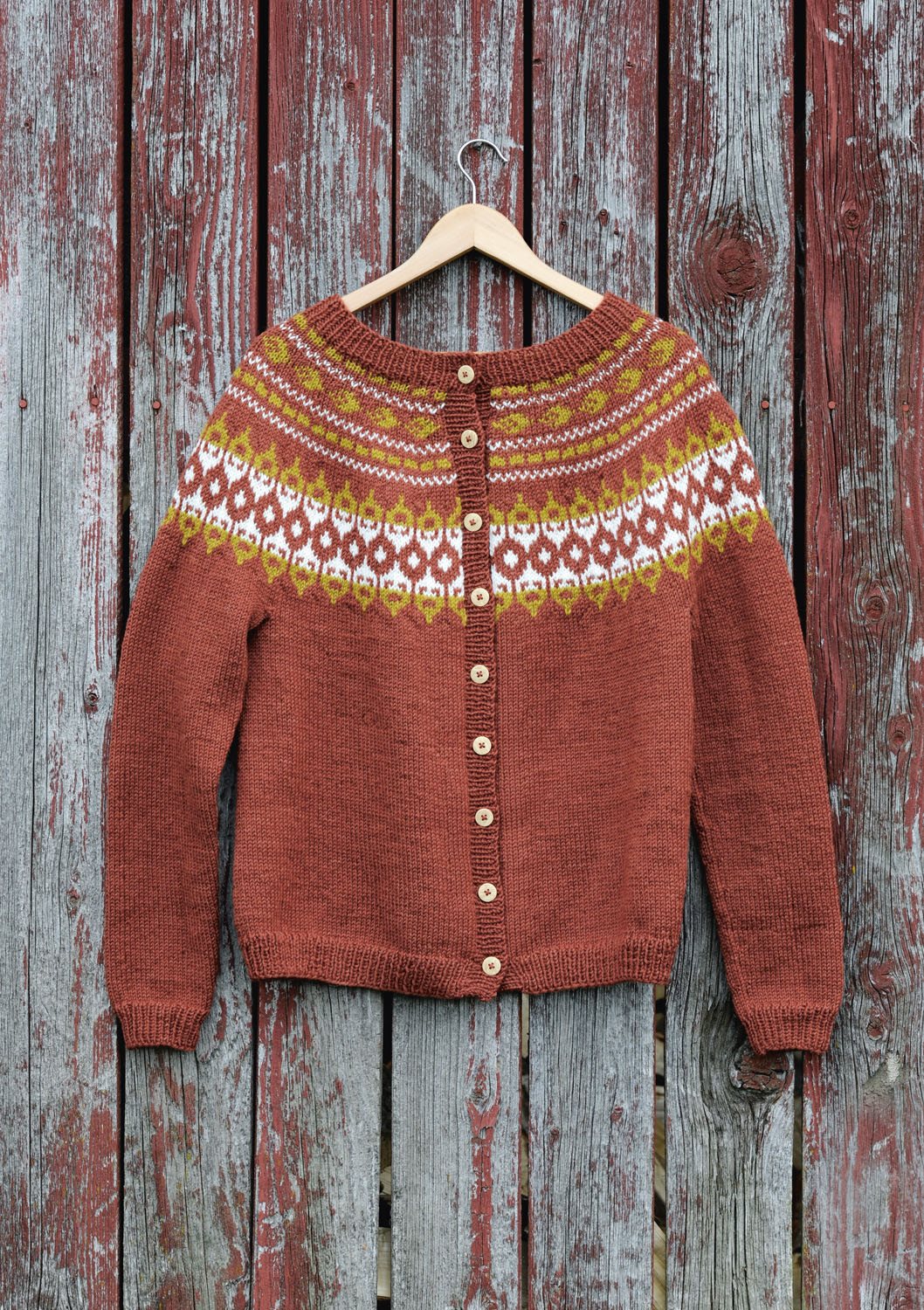 På bild stickad i 3355 Bränd Orange (F1), 1002 Benvit (F2) och 2035 Ockra (F3)