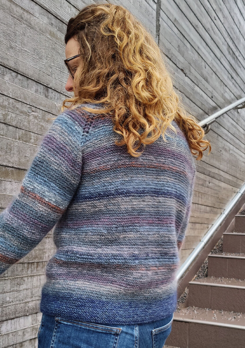 På bild stickad i Finull 4124 Blåmussla med restgarner av mohair: Tynn Silk Mohair 4631 Dov Syrén, 6707 Stålgrå, 6012 Ljusblå, 5581 Djup Marin, 3554 Rost och 3021 Ljus Beige samt Tilia 349 Mauve.
