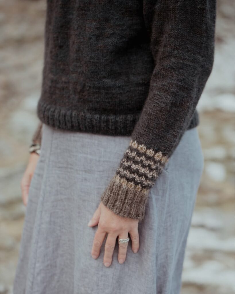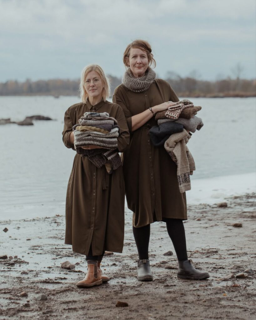 Ön och skogen innehåller 12 stickmönster, alla utformade för att kännas tidlösa och användbara genom årstidernas alla växlingar. ”Den här boken är ett försök för oss att tolka våra olika platser, landskapet och känslan i det, det ständigt närvarande och skiftande vädret, i form av maskor och ull”, säger Erika och Lotta.