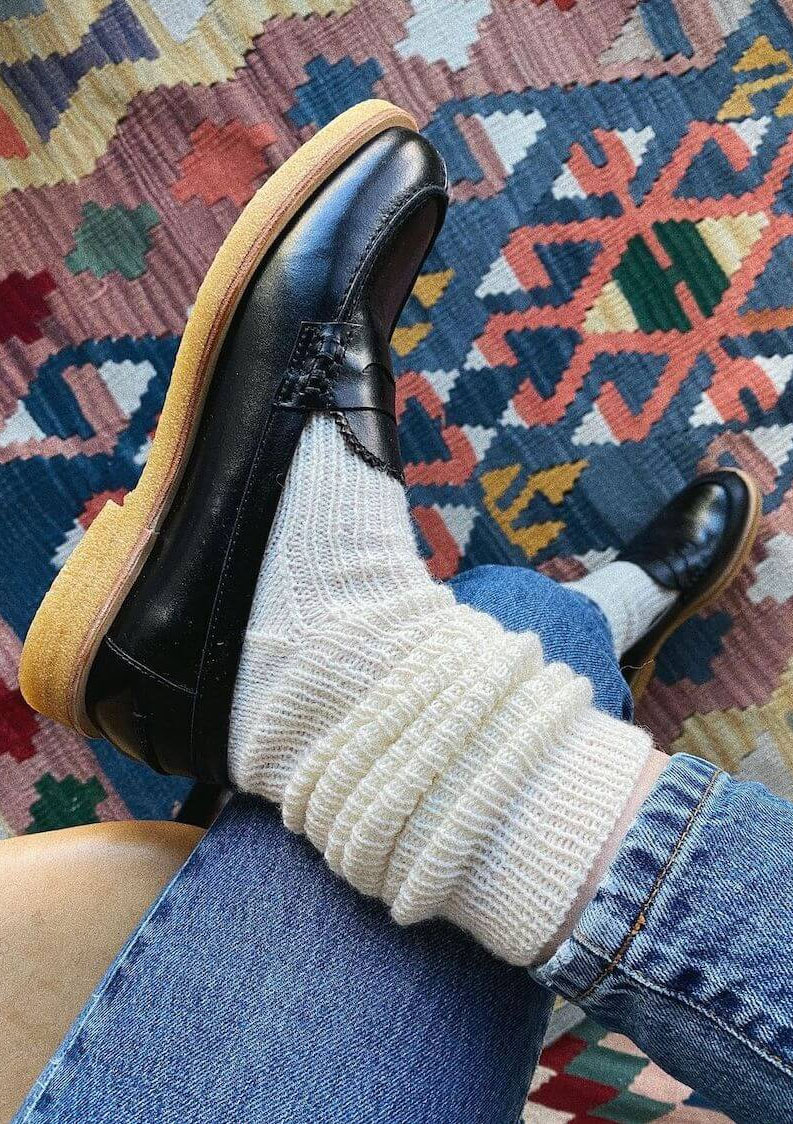 Penny Socks stickas från skaftet och ner mot tån. Sockorna stickas med enkel resår (1 rm, 1 am) på skaftet och fotens ovansida, och slätstickning på fotens undersida. Penny Socks är långa och tänkta att sitta ledigt och nedhasat runt anklarna.