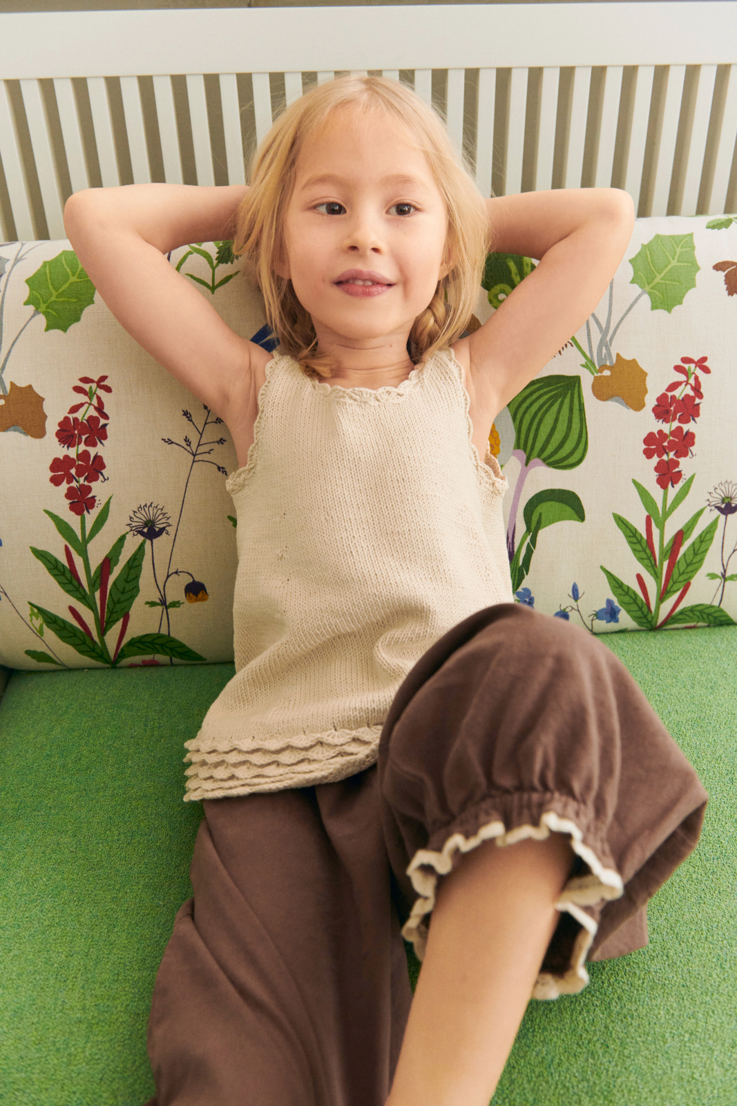 Roselynn Singlet & Pants är ett fint linne med matchande byxor stickat uppifrån och ner med virkade uddkanter.