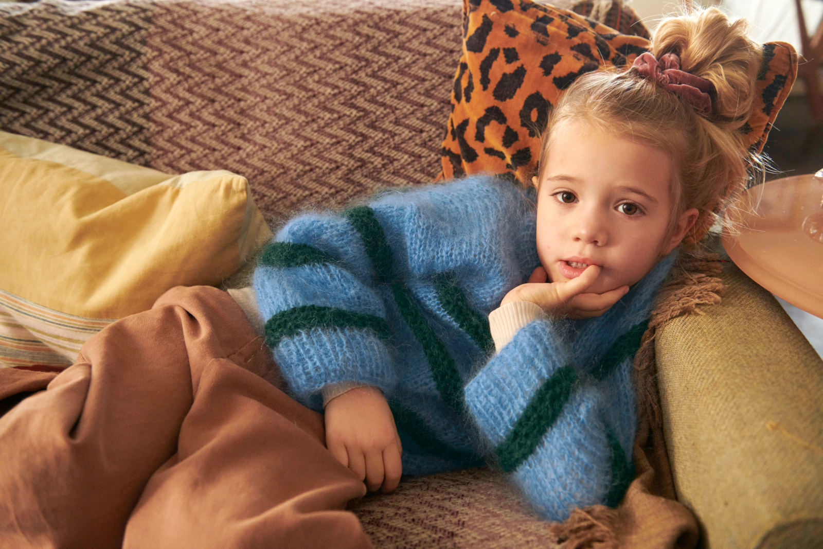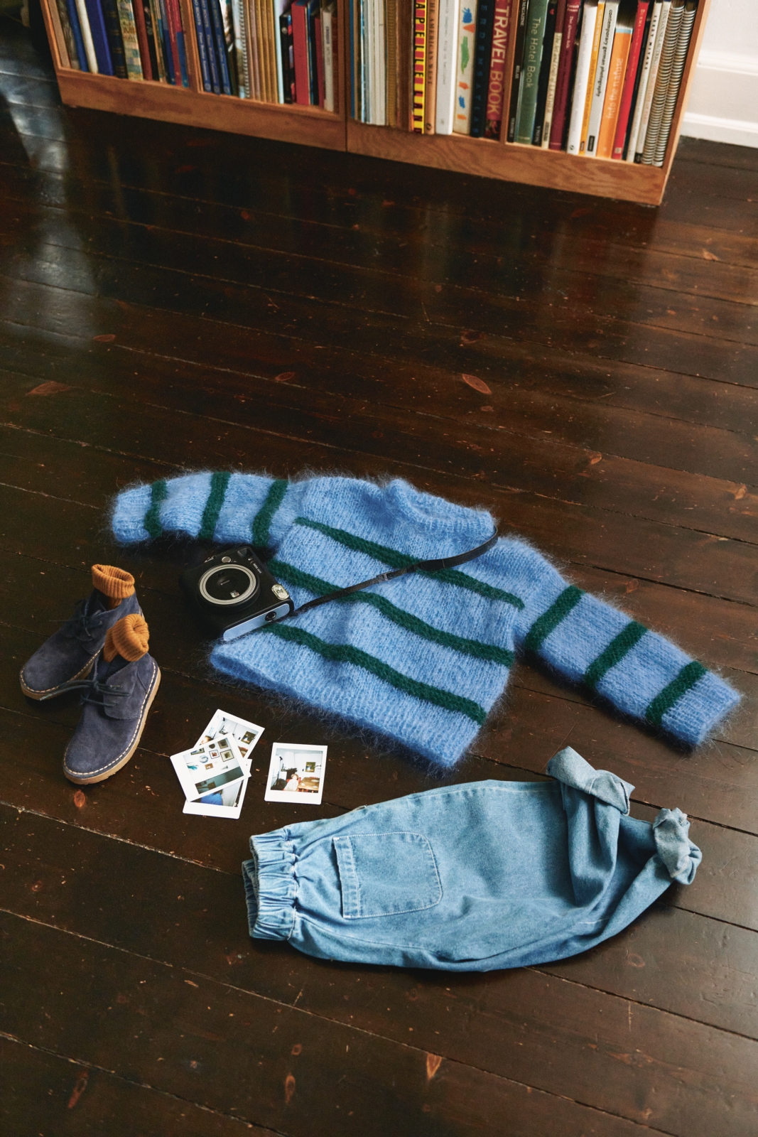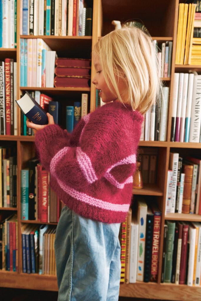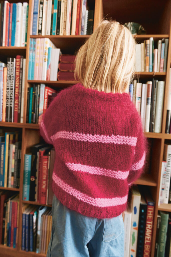 Skye Sweater Junior stickas uppifrån och ner i Ballerina Chunky Mohair med ränder i Kos.