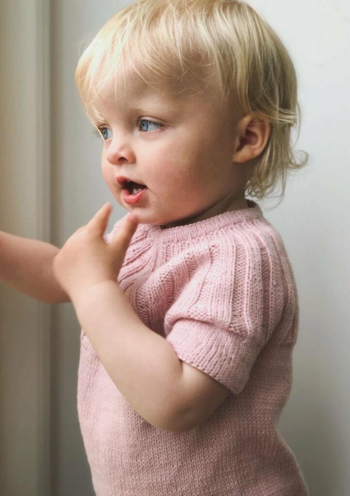 Sunday Tee Mini stickas uppifrån och ner. Oket stickas runt i resårmönster med ökningar. Bålen och ärmarna stickas runt i slätstickning och avslutas båda med en vikt kant.