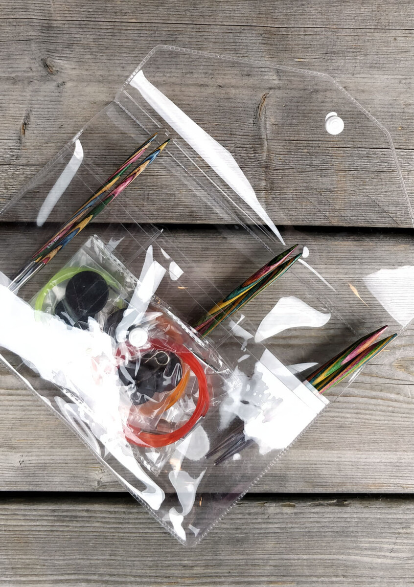 Innehåller både ändstickor i KnitPros Symfonie Wood (björkträ), kablar, stoppar samt en väska med fack att förvara sina stickor i.
