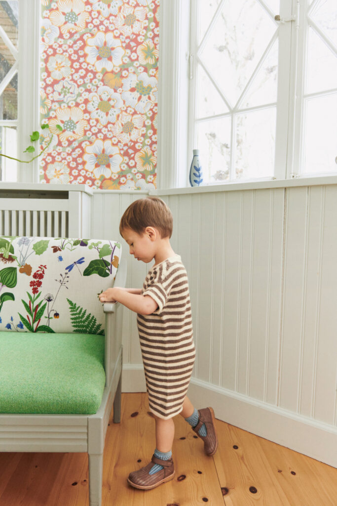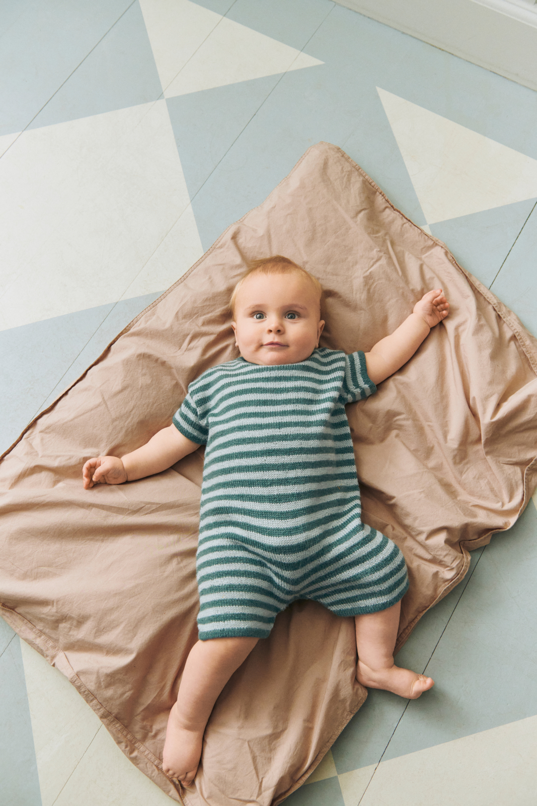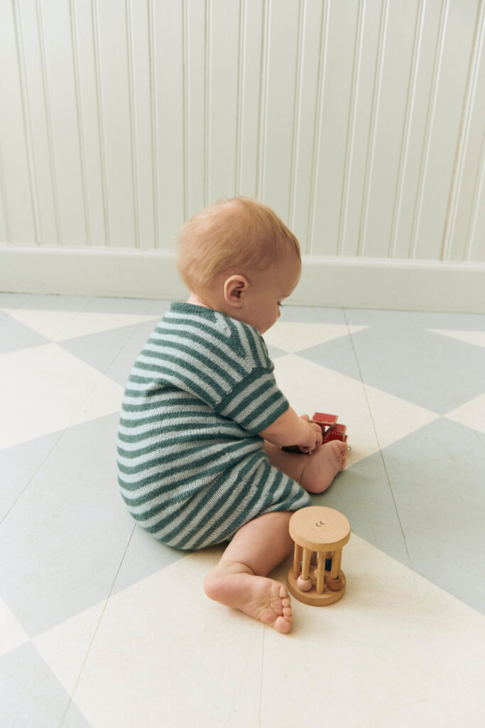 Theodore Playsuit Baby är en randig romper stickad uppifrån och ner med formade axlar och öppning med tryckknappar.
