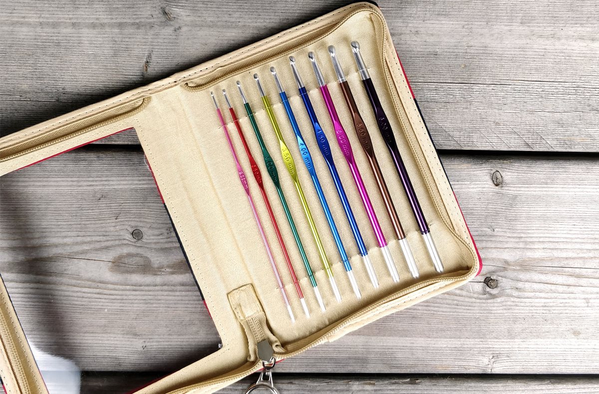 Set med 9st virknålar i metall från KnitPro i deras märke Zing, där varje storlek har en egen färg. Kommer i en praktisk förvaringsvästa med dragkedja.